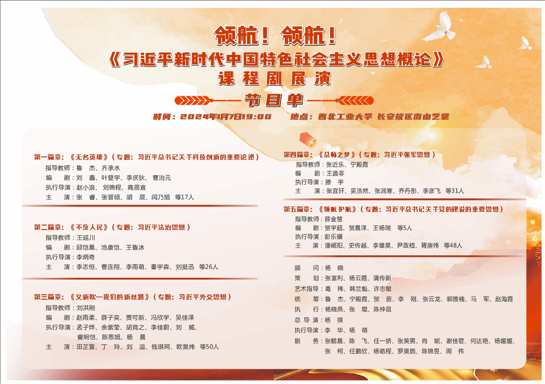 本次展演共5个子剧目,分别根据《概论》课中的“习近平总书记关于科技创新的重要论述、习近平法治思想、习近平外交思想、习近平强军思想、 习近平总书记关于党的建设的重要思想”等5个专题进行创作。我校思政课教师通过指导随堂上课的学生精心打磨剧本,融情于景,寓教于剧,在剧中体验时代变迁,感悟信仰力量,将家国情怀、科学家精神、“总师育人文化”等精神文化融入剧本创作中,让学生更加深刻地学习领悟习近平新时代中国特色社会主义思想和党的二十大精神。