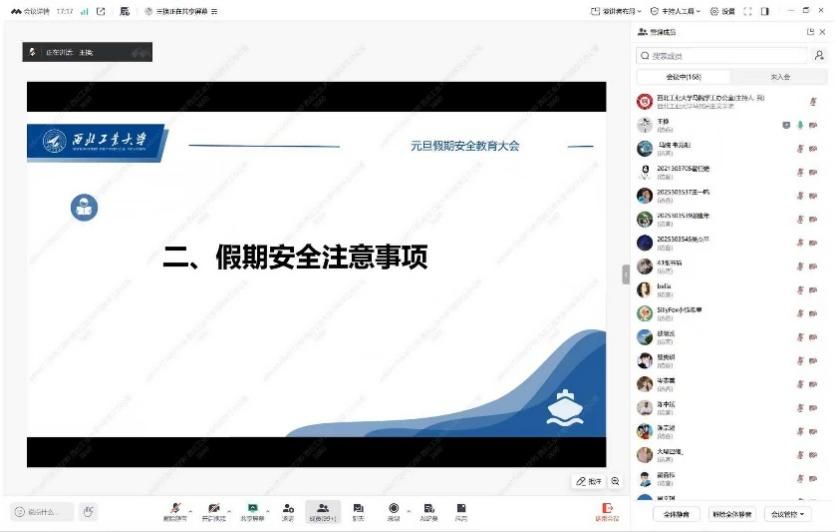 12月24日21时,学院线上召开元旦假期安全教育大会,由学工主管刘敏主持,耿云辉副书记及全体辅导员、学生参会。会议明确假期安排与请销假要求,强调严格遵守系统流程,确保去向清晰可控。与会老师分专题开展安全教育:王换解读交通、饮食、人身财产等安全要点;董润强化保密与信息安全意识;许斯诺结合高校典型案例推进国家安全教育,引导学生明晰责任、守住底线。耿云辉总结传达学校学生工作会议精神,结合学院学子使命提出要求,强调关注身心状态、主动调适情绪,将安全意识内化于心、外化于行,平安充实过节。